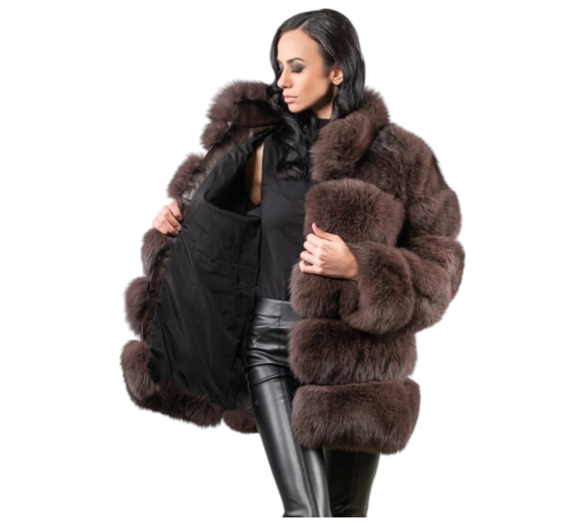 A distinguished brown fox fur jacket featuring horizontal paneling that creates visual depth and refined structure. The warm, earthy tones offer exceptional versatility across multiple styling contexts, while the strategic horizontal construction enhances the silhouette with contemporary sophistication. Premium fox fur delivers outstanding insulation and a luxuriously soft hand-feel, positioning this piece as an essential investment for those who appreciate both technical excellence and elevated design. Perfect for discerning individuals seeking enduring elegance with architectural precision.